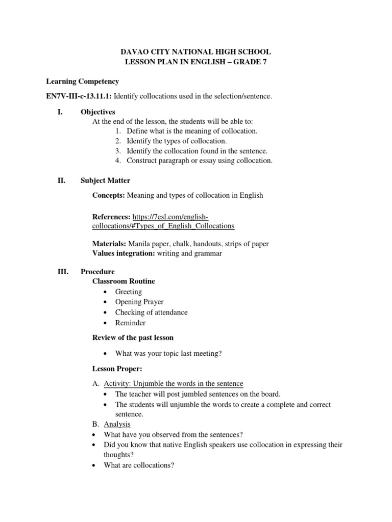Dcnhs Grade 7 Lesson Plan 3 Final Lesson Plan English Language