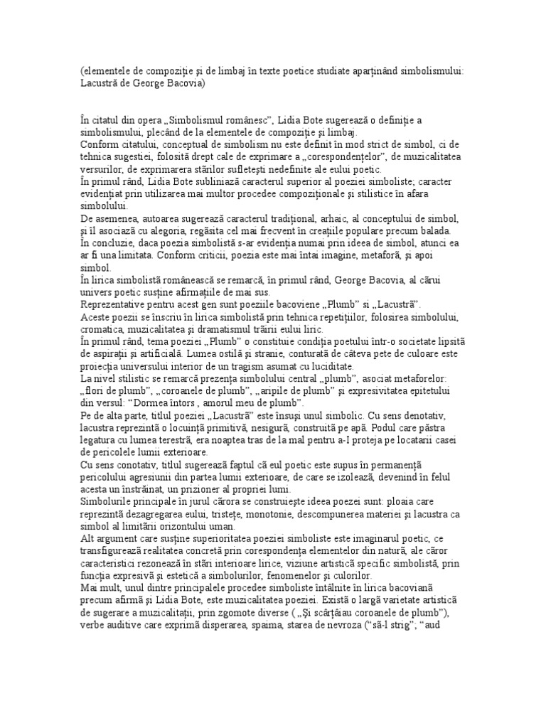 Text Poetic Bacovia Elementele De Compoziţie Si De Limbaj In Texte Poetice Studiate Aparţinand Simbolismului Lacustră De George Bacovia