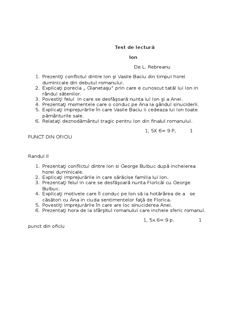 11 decembrie 2009 22 43. în acest test întâlnești întrebări din prima parte a romanului. Test de lectură la romanul ion de liviu rebrenu. Cum multe materiale de pe acest site mi au fost de mare ajutor sper sa fie de folos tuturor.